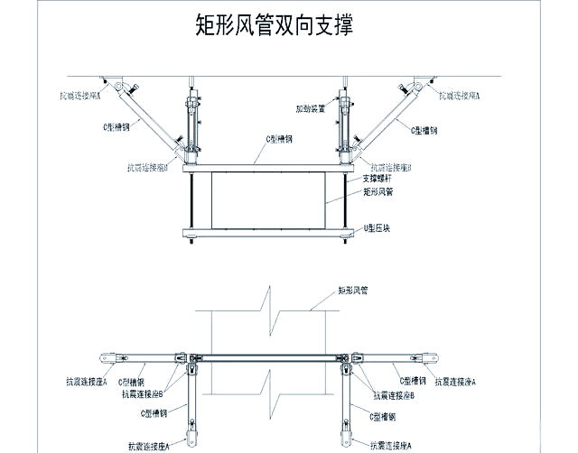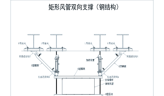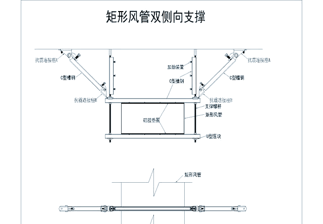 通过合理布置和稳固安装,这种双侧向支撑能够有效增强矩形风管在地震等外力作用下的稳定性,确保其安全可靠地运行。
