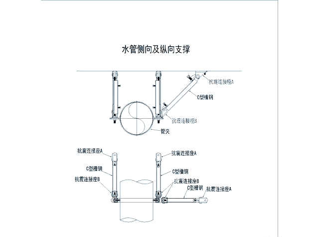 在建筑过程中,水管的安装与支撑是一个关键环节。单纯提供侧向支撑不足以保障其稳固性,因为纵向支撑同样至关重要。通过精心设计和合理布置,我们必须在侧向和纵向两个方向上都为水管提供稳固的支撑,以确保其结构的稳固,并进一步强化其抗震能力,从而为建筑物的整体安全提供有力保障。